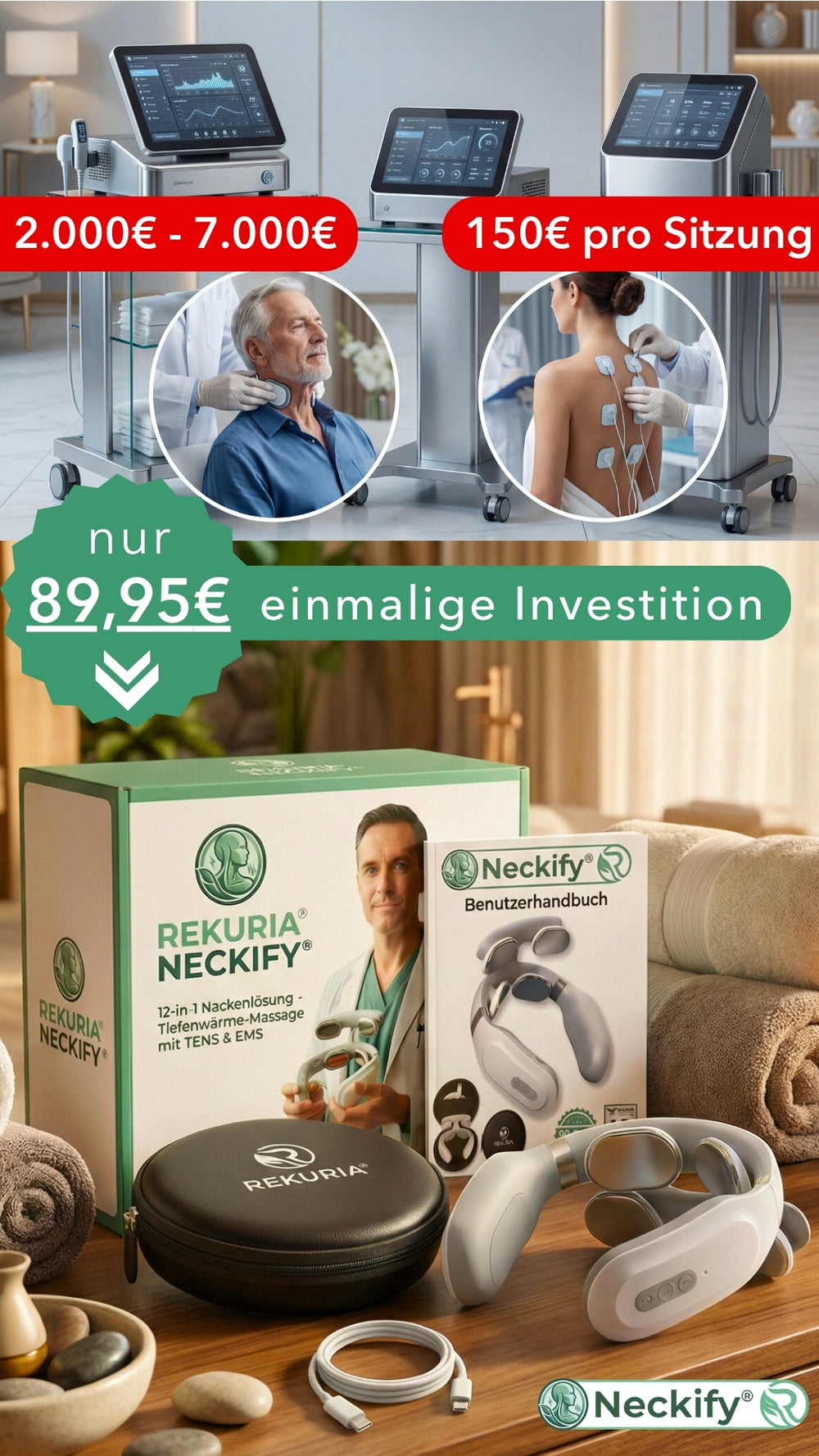 Die gleiche Wärme- und EMS-Therapie, die auch in physiotherapeutischen Praxen und Reha-Kliniken eingesetzt wird – wo eine einzelne Sitzung oft über 150 € kostet – steckt jetzt im REKURIA® Neckify®.